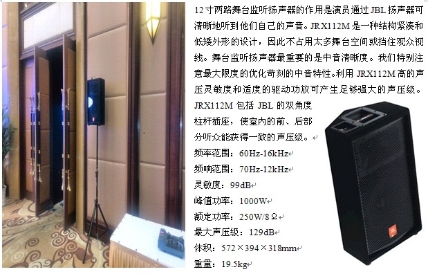 我公司提供了JBL PRX625音响2只和JBL JRX112音响4只就让可容纳1200人的迎宾厅现场达到剧场式同声传译的效果。