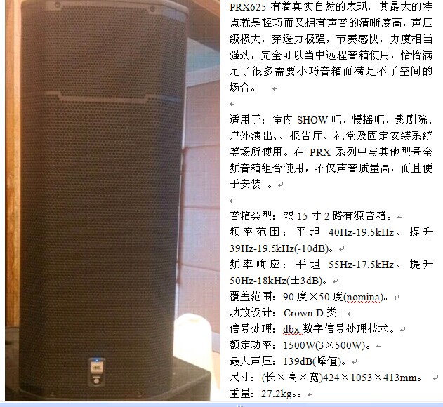我公司提供了JBL PRX625音响2只和JBL JRX112音响4只就让可容纳1200人的迎宾厅现场达到剧场式同声传译的效果。