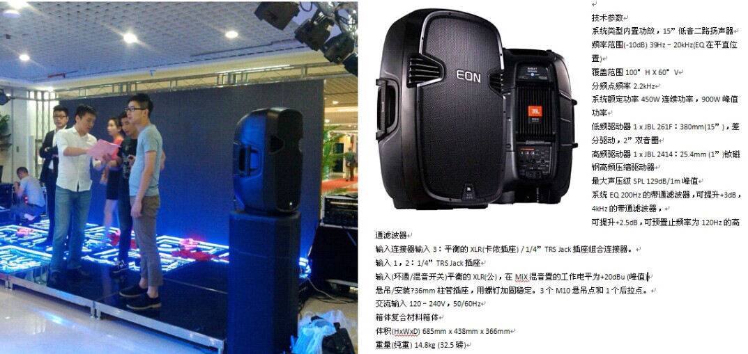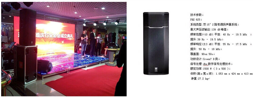 典礼现场音响设备由我公司提供,JBL PRX625(2只)、JBL EON315、JBL EON515(各一只),声艺32数字调音台一台,还有周边设备。